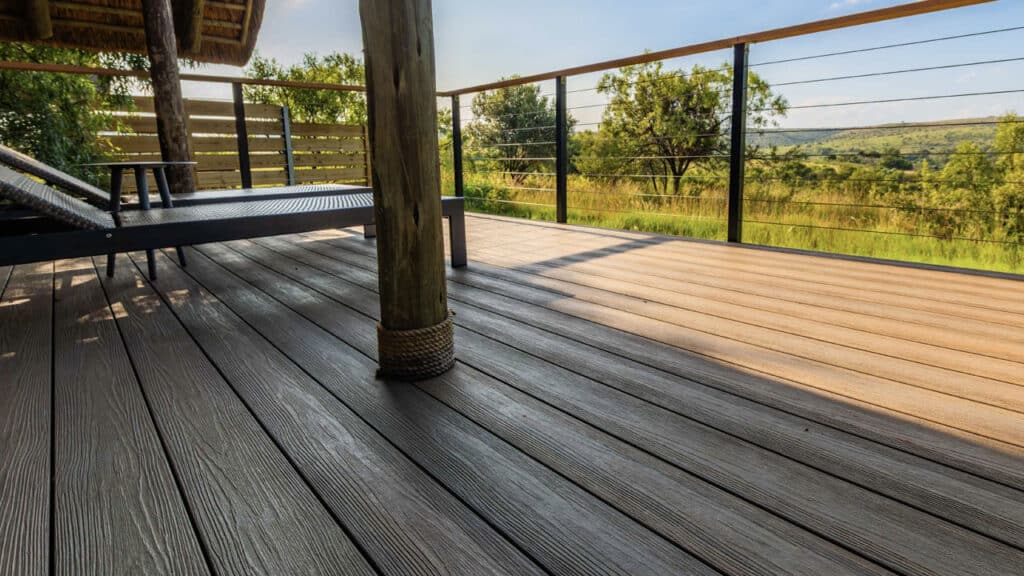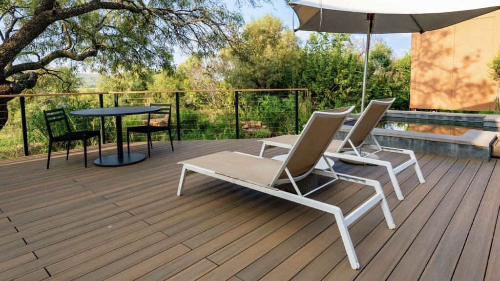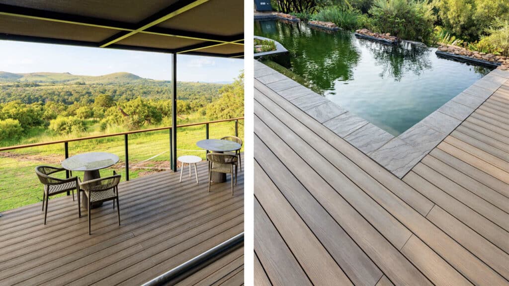 Dale Fogg of DMF Designs was appointed to construct and manage the upkeep of the establishment’s extensive facilities to enhance the natural environment. Just as Homo Naledi stood the test of time, Fogg’s task was to select durable materials that would enhance the visual appeal, structural safety, and functionality of the facilities while withstanding high footfall and demanding weather conditions. 30 upmarket rooms – each with a private viewing deck or veranda – invite guests to immerse themselves in the fauna and flora of the African savannah while experiencing the tranquil passing of time. 24 sustainably built timber and thatch chalets on stilts offer unparalleled views, while six sumptuous ‘sky rooms’ are nestled on the hillside to echo safari style sophistication. A remote five-bedroom private lodge tucked away within the estate – the Riverhorse Lodge – offers complete seclusion and privacy. An expansive deck pavilion with a natural wetland pool invites visitors to cool off or catch some sun, creating a classy entertainment venue that’s ideal for memorable events such as weddings, birthdays and other outdoor gatherings. The Pavilion with a capacity of 3 000 people, caters to large conferences or events, such as international press conferences for important archaeological findings, combining luxury business and leisure activities for visitors to the site. A world-class restaurant offers organic, gastronomic delights and sunset cocktails on the durable bamboo composite deck blending seamlessly with the sprawling game-filled valley below. The serene Inyala Spa invites guests to rest and rejuvenate alongside a natural echo-pool. These decks are subjected to the harsh African sun and typical Highveld thunderstorms and need to withstand the constant expansion and contraction of the deck boards resulting from the temperature changes and exposure to damaging UV-radiation. Splinters, cracks, warping or lifting become unattractive and unsafe on a conventional deck over time, which is non-negotiable for a luxury lodge where understated luxury and effortless style is paramount. What’s more, all the exterior deck surfaces, particularly of the pool deck and pavilion, need to exhibit outstanding wear characteristics able to withstand abuse or abrasion as guests spill drinks or drag sun loungers to various vantage points, and walk barefoot, often with oily feet. Frequent sanding, smoothing, or varnishing would inconvenience guests, and regular repair or replacement might not be cost-effective or desirable for a premium-priced establishment.e or size of the project.